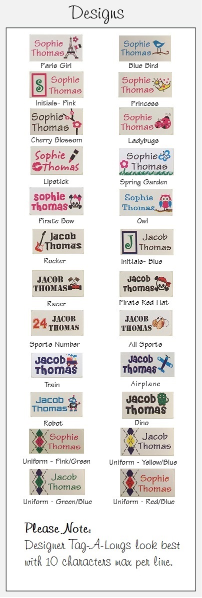 Please Note: Designer Tag-A-Longs look best with 10 characters max per line.